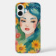 Este diseño vibrante y caprichoso presenta un retrato abstracto de una mujer con el pelo azul verde azulado adornado con flores de colores. Su expresión serena se acentúa con los ojos cerrados y los labios rojos, dándole una apariencia de ensueño. A su alrededor hay girasoles vibrantes, flores rosas y un conjunto de follaje verde, creando un ambiente exuberante y de jardín. La pieza tiene un estilo suave, vectorial, pintado, que le da un toque moderno y a la vez romántico. La paleta de colores está dominada por tés, amarillos, rosas y verdes, lo que crea una composición armoniosa y llamativa. Personalizar con iniciales.