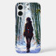 Un estuche de teléfono inspirado en el anime que presenta a un chica caminando por un bosque sereno de bambú cubierto de nieve. Perfecto para un paisaje invernal tranquilo y para los amantes de la estética pastel.