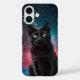 Un gato negro místico encaramado sobre una luna en una galaxia vibrante, ideal para diseños oníricos y cósmicos.