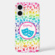estuche para iPhone con estampado alegre de color arcoiris de iconos relacionados con el teatro sobre fondo blanco, con máscaras dramáticas de color acuático en un círculo donde puedes añadir un nombre, fecha, iniciales, etc. para personalizar este funda para tu amante del teatro favorito. Algunos de los íconos incluyen: Shakespeare, máscaras dramáticas, micrófono, notas musicales, silla de director, entradas, estrellas, cortinas escénicas, reflectores, rosas y más.