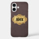 Una textura de cuero oscuro es el fondo sencillo para una insignia de estilo grunge de aspecto vintage personalizada con tu nombre en este estuche para iPhone.