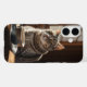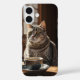 Escena encantadora de un gatito de tabby gris que disfruta de la mañana con una taza de café, cálida y acogedora estética.