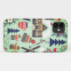 Cubierta IPhone de invierno/feriado - los colores son azul, azul, rojo, blanco y marrón/marrón. El diseño incluye cabaña, zorro, esquí, mitones y una taza de cacao.