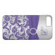 Funda monogramado moderno morado y gris plateado con damasco floral iPhone 7 con cinta IMPRESA y broche de joyas IMPRESIONADAS. para agregar su nombre, inicial u otro texto. Si necesita ayuda, envíe un correo electrónico a niteowlstudio@gmail.com.