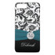 Monogramado moderno modelo de damasco floral blanco y negro Funda-Mate iPhone 7 Funda con cinta verde azulada azul IMPRESIONADA y broche de cristal con aspecto falso grabado. Personalizar para agregar tu nombre, inicial u otro texto. Si necesita ayuda, envíe un correo electrónico a niteowlstudio@gmail.com.