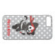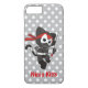 Un personalizado divertido funda iPhone 7/8 hecho en un fondo polka polka blanco y gris claro, con gráficos personalizados de un gato ninja negro, en una máscara roja. Ninja Kitty en negrita rojo puede ser personalizado para leer lo que quieras.