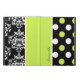 Caja bonita del aire 2 del iPad, con construido en soporte y los gráficos de tres rayas de diversos modelos. Un modelo blanco y negro del damasco, un chartreuse sólido, y un negro con los lunares blancos y chartreuses. Personalice el texto negro para adaptarse a sus necesidades. Hace una idea excelente del regalo.