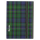 Elegante funda de aire para iPad, con soporte incorporado, hecho en el clásico patrón de estratificación tartan MacBride de clan verde, azul, negro, amarillo y rojo. El texto de personalizado blanco, en el frente izquierdo, está listo para personalizar para usted o como una gran idea de regalo.