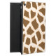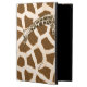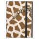 Funda de aire para iPad divertido, con soporte incorporado, y gráficos de un patrón de piel de jirafa marrón y marrón. Una foto realzada gráficamente de la cabeza y el cuello de una jirafa se extiende por el frente del funda. El texto marrón en el frente está listo para personalizarse para usted o como una gran idea de regalo.