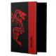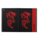funda de aire para iPad personalizado, con soporte incorporado, hecho en negro, con gráficos de un dragón de estilo chino rojo, en la parte delantera y trasera. Una banda roja, en el borde derecho delantero del funda, tiene texto negro personalizado listo para personalizar para usted o como una gran idea de regalo.