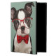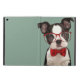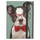 Ilustracion lindo de los vidrios del inconformista que llevan del estilo de Boston del terrier de un ojo del perrito y de la pajarita roja elegante en fondo azul. Diseñado por Maryline Cazenave.