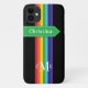 Este funda Funda-personalizado de mate personalizado para iPhone 11 tiene un patrón de franjas verticales de color arcoiris en el centro con una cinta de pancartas verde que corre horizontalmente por debajo de la cámara que tiene costura blanca y letras blancas que se pueden personalizar con su nombre u otro texto. También hay un monograma de 3 letras centrado en la parte inferior. El fondo negro se puede cambiar para que sea cualquier color que desee. ¡Te sentirás orgulloso de presumir de este funda moderno y moderno que hace una declaración de moda! Si necesita ayuda, envíe un correo electrónico a niteowlstudio@gmail.com.