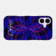This iPhone 16 phone case features a blue purple color geometric circular 3D flower petal theme. The case can be personalized with custom text and also features iPhone model case change options.