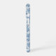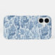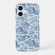 Escena de pueblo de una época pasada de ganado, gente, casas de piedra y puentes en un hermoso y elegante patrón de tela de jouy. Bonito color azul tradicional.