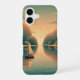 Ilustración vintage de una bahía rodeada de acantilados simplificados y agua tranquila en una paleta cálida.
