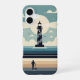 Faro estilizado sobre una base geométrica retro con una paleta oceánica.