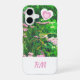 A pretty iPhone case with photographic design of pink wildflowers and grass, with cute hearts and custom initials