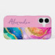 El estuche de teléfono celular tiene un bloque sólido de color rosa en un lado y un patrón de giro arco iris con falsos acentos purpurinas de oro en el otro lado. Personaliza con un texto inicial, nombre u otro texto para una gran idea de regalo.
