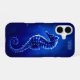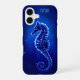 This personalized ocean phone case features a glowing blue seahorse on a deep blue background.