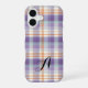This phone case showcases a stylish purple tartan plaid pattern accented with orange and green lines. Featuring a customizable monogram, it blends classic charm with a personal touch, making it perfect for daily use or as a thoughtful gift.