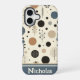 Un elegante patrón con varios círculos y motivos botánicos en una apacible paleta de beige, marrón, negro y azul. Este diseño minimalista evoca un ambiente sereno de bosques.