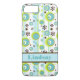 Este funda Funda-personalizado Mate iPhone 7 tiene un fondo rayado blanco y azul acuático con un patrón abstracto de flores y círculos de color verde limón, turquesa, marrón y blanco con una banda para añadir tu nombre, inicial, monograma u otro texto. ¡Este nuevo funda moderno y de moda hace una declaración de moda para el joven y moderno modistonista! Si necesita ayuda, envíe un correo electrónico a niteowlstudio@gmail.com.