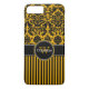 Este funda Funda-personalizado de Mate amarillo dorado y negro personalizado para iPhone 7 tiene un patrón de fondo de damasco y rayas con una banda y círculo en blanco y negro para añadir tu nombre, iniciales, monograma u otro texto. ¡Este nuevo funda moderno y de moda hace una declaración de moda para el joven y moderno modistonista! Si necesita ayuda, envíe un correo electrónico a niteowlstudio@gmail.com.