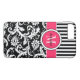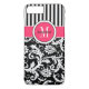 Este funda Funda-personalizado para iPhone 7, blanco y negro personalizado, tiene un amortiguador floral y un patrón de fondo rayado con una banda rosa y blanca caliente y círculo para añadir su nombre, iniciales, monograma u otro texto. ¡Este nuevo funda moderno y de moda hace una declaración de moda para el joven y moderno modistonista! Si necesita ayuda, envíe un correo electrónico a niteowlstudio@gmail.com.