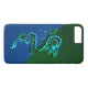Funda iPhone 7 Plus con temática de fantasía colorida hecho en un patrón verde sobre gradiente verde, en la parte superior del funda y un patrón azul gradiente, en la parte inferior. Obra gráfica de un dragón de estilo chino azul y verde decora el medio del funda. Personalizar para agregar cualquier texto que desee a este funda único.