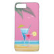 Un ilustracion de cócteles tropicales en rosa brillante y azul sobre un fondo de playa con cielo rosa y acentuado con hojas de palma y gaviotas, decora este Funda de iPhone 7 Plus, recordándonos las cálidas vacaciones soleadas.