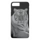 funda personalizado iPhone 7 Plus, con una fotografía de primer plano de un tigre blanco sobre un fondo negro. El texto negro, en la parte inferior, está listo para personalizar para ti mismo o como una buena idea de regalo para tu tigre favorito o fanático de la vida salvaje.