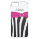 Patrón animal de rayas de cebra rosa, negro y blanco moderno personalizado Barely There™ iPhone 7 funda con cinta IMPRESA y broche de joyas de cristal.