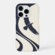 Abstract minimalist phone case featuring a flying bird silhouette with flowing curved shapes in navy and cream tones. Clean vector artwork with a modern aesthetic, designed for Apple iPhone 16 Pro.