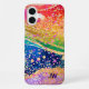 Estuche de teléfono celular con un patrón giratorio de color arcoiris. El confetti falso purpurina y los acentos dorados le dan un toque festivo. Añadir iniciales para un toque personalizado en letras negras.