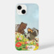 This charming iPhone 13 case features a whimsical illustration of a bear and a raccoon enjoying a peaceful picnic in a colourful flower field. With a backpack by its side, the bear sits upright, nibbling from a container, while the raccoon lounges contentedly, munching on a delightfully long sandwich.