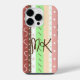 Estuche de teléfono caprichoso y caprichoso con un patrón de rayas y puntos de polka rosa, malva, marrón, borgoña y verde sabio. Colores cálidos de tierra.