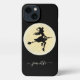 Imagen de una silueta de bruja montada en un palo de escoba frente a una luna brillante. La bruja tiene el pelo largo soplando en el viento, un gorra de bruja puntiaguda, vestido con falda y zapatos de tacón altos. Personalice con su nombre o mensaje en letra de script en blanco roto. Colocado en negro sólido.