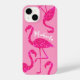 Personalice el estuche para iPhone chismoso y moderno con su nombre. Hermosos purpurinas brillantes y glamorosos, brillantes y brillantes brillan el verano con un patrón exótico de pájaro flamingo en rosa claro. ¡Foto del purpurina de chispas rosas!