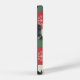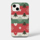 A seamless pattern of a Christmas scene with a snowy landscape. There are Christmas trees with ornaments and a star on top, Santa Claus, a sleigh, and presents. There are also houses with smoke coming out of the chimneys. The ground is covered with snow. The background contains mountains. The overall pattern has a warm and cozy atmosphere. Less