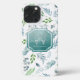 Estuche para iPhone de color acuático elegante con hojas botánicas monograma. Las hojas de acuarela están decoradas en tonos pastel verdes y azules.