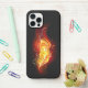 Una brillante pluma de pavo real hecha de fuego y llama sobre fondo negro.