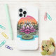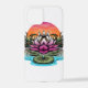 Una escena de puesta de sol serena y cautivadora con una hermosa flor blanca de loto con delicados toques de rosa, flotando con gracia en el centro de un estanque tranquilo. El loto está rodeado de exuberantes colchonetas de lirios verdes, y el agua es tranquila y refleja los impresionantes colores de la puesta de sol, que reflejan naranjas suaves, rosas y moradas. Como telón de fondo, varias plantas y cepillos crean un entorno natural tranquilo, mientras que algunas nubes espesas le dan profundidad al cielo lejano. El conjunto evoca una sensación de tranquilidad y belleza natural, con el loto como punto de convergencia de la serenidad en medio de los tonos vivos del sol.