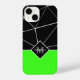 Personaliza con tu nombre inicial. Proteja su teléfono con estilo con estuche de teléfono diseñado por el personalizado. Geométricos triángulos negros líneas blancas patrón retro diseño fresco con verde neón. Patrón gráfico de líneas de triángulos negros geométricos elegantes en blanco y negro.