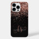 Estuche Glam Rosa Gold Purpurina Elegante Monograma para iPhone. Personaliza fácilmente este diseño de moda de estuche de teléfono de moda con elegante purpurina brillante de oro rosa sobre un fondo negro. El diseño incluye su monograma manuscrito con giros de bonito y nombre.