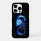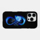 Luminous infinity symbol with glowing, beautiful, lushly blooming rose made of blue flames on black background.