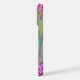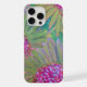 Flores rosa sobredimensionadas con pétalos verdes adornan este estuche para iPhone, pintado a mano, una obra de arte de medios mixtos.