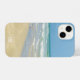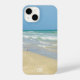 Hermoso monograma de playa iPhone 14 funda con magnífica fotografía costera con un bonito de arena parado al borde de las olas del océano en un soleado día de verano. Unas bonitas olas de agua azul verdoso se extienden hasta la orilla de arena donde tu texto personalizado está personalizado en una encantadora tipografía cursiva blanca. Un hermoso regalo de la isla.
