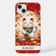 Make a statement with this iphone 15 plus phone case that features a Lucky Cat with gold coins and flowers around it on a red and gold background. It's modern yet traditional Japanese Maneki-neko is designed to attract good fortune, prosperity and customers into your business. The right paw raised brings money and wealth and the white cat symbolizes general happiness. It becomes uniquely yours with your name in a CAP font in black. Invite luck and prosperity into your life!