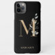 Letra M monograma floral. Letra M en textura marrón dorada acentuada con hojas de compuestos de acuarela verde, flores y polvo de oro. Personalizar con el nombre en el tipo de letra coincidente.