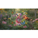 Una vibrante maleta telefónica con una mariposa grande y estilizada en tonos rosa y blanco, colocada sobre un fondo de flores de colores. El diseño se compone de diferentes flores en tonos morados, amarillos y rosas, lo que crea un ambiente animado y alegre.